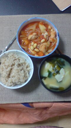 トマト缶と鶏肉に大豆、玉葱と人参にちょっとじゃがいも。